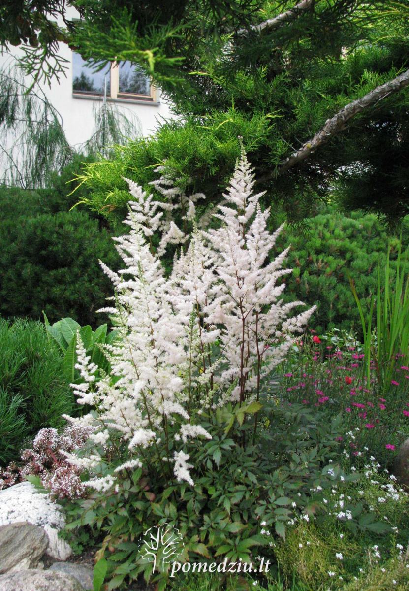 Tai – astilbė. Ši gėlė geriausiai auga šviesioje paunksmėje arba pusiau paunksmėje, mėgsta derlingą žemę. Žaliame spygliuosčių fone atsiskleidžia visas gėlės grožis. Šalia auga smulkiažiedis šilinis gvazdikas ryškiais žiedeliais. Jis gali būti naudojamas skaudančioms, pavargusioms akims gydyti. O smulkūs balti žiedeliai – tai jau baigiančios nužydėti visžalės rudgrūdėlės. Iš kairės pusės šalia astilbės auga šilokas. Šalia stambių astilbės žiedų šios trys smulkiažiedės gėlės – tarsi maži „desertukai“, gražiai papildantys bendrą augalų kompoziciją.